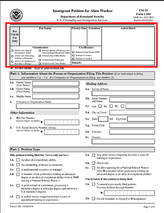 미국 시민권 및 이민 서비스국에 제출하는 이민 청원서입니다.